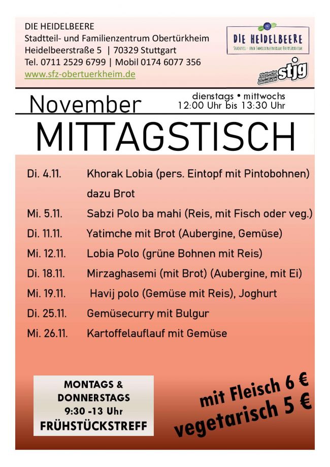 Jeden Dienstag und Mittwoch bieten wir ab 12 Uhr ein frisch zubereitetes Mittagessen an.